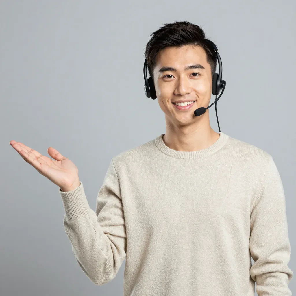 A young man wearing a headset extends his hand, showcasing a soft sweater and smooth headset under even, soft lighting. The neutral tones and minimal background highlight the subject's approachable demeanor and professional setting.